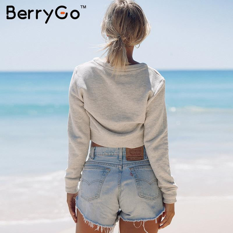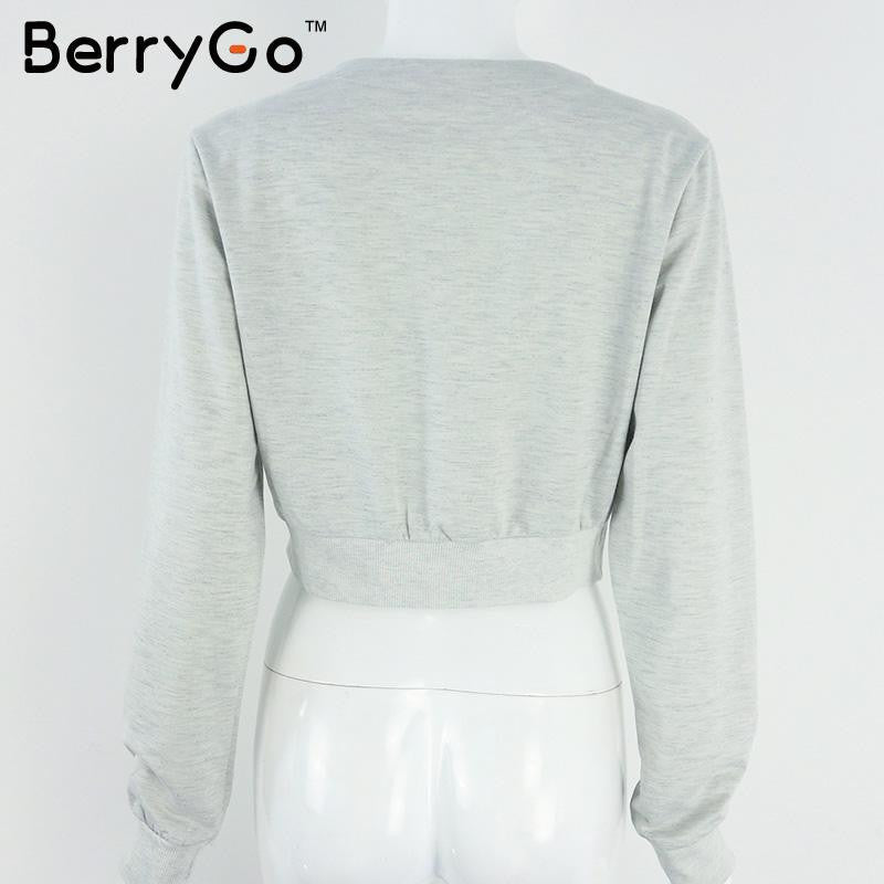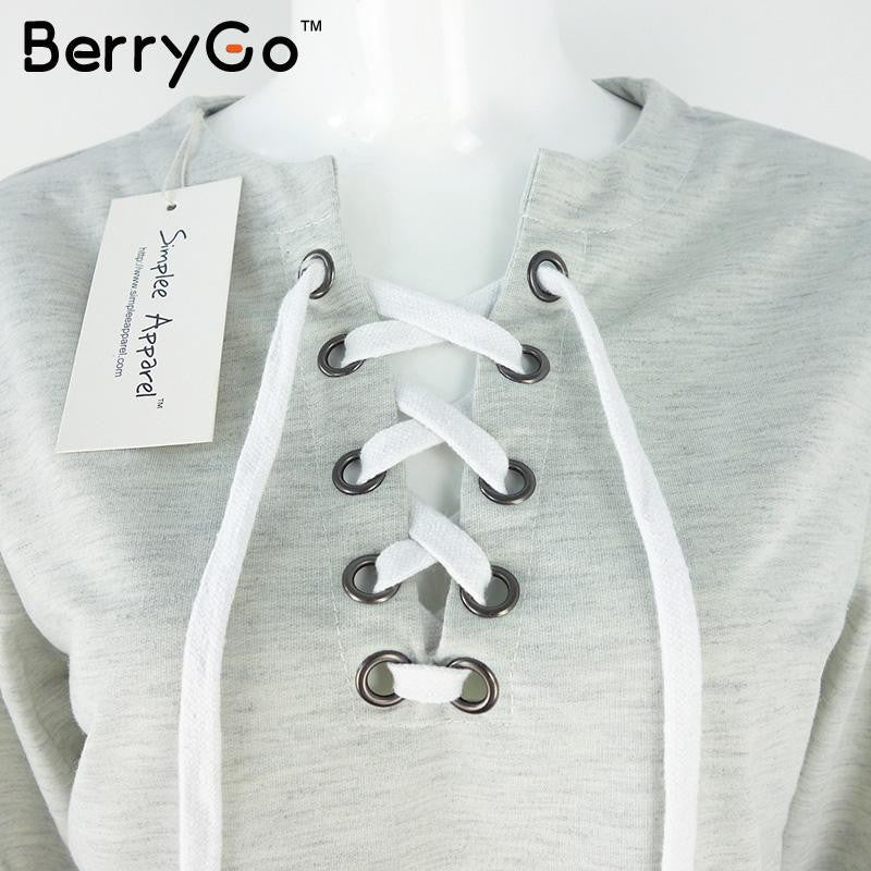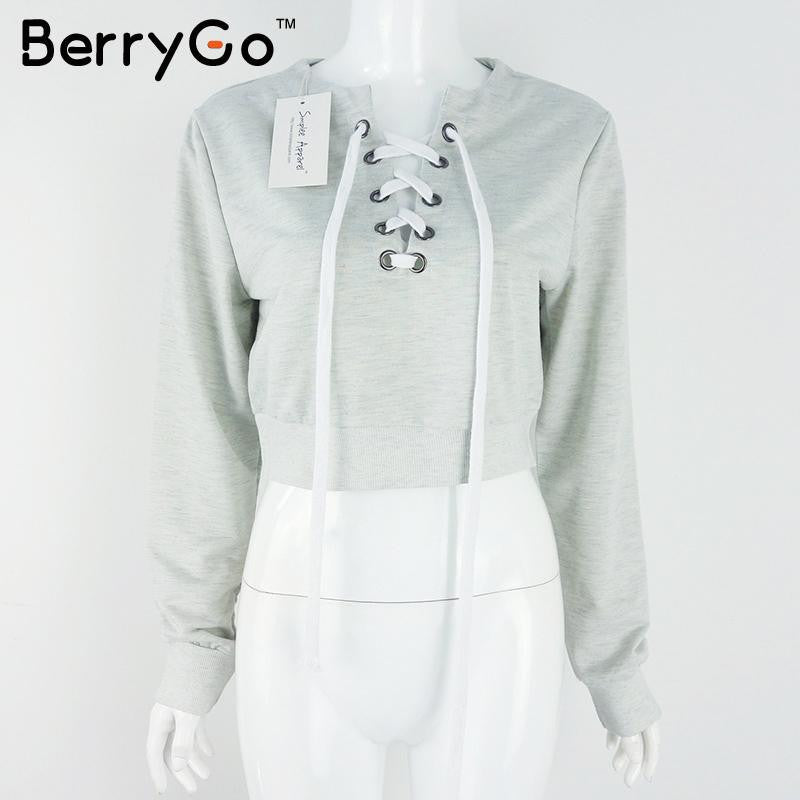 BerryGo Gray lace up ladies sweatshirt women Autumn crop top long sleeve girl v neck hoodies sweatshirt warm casual female tops