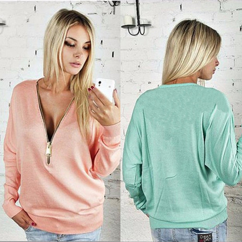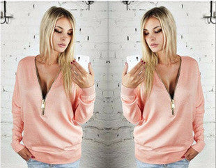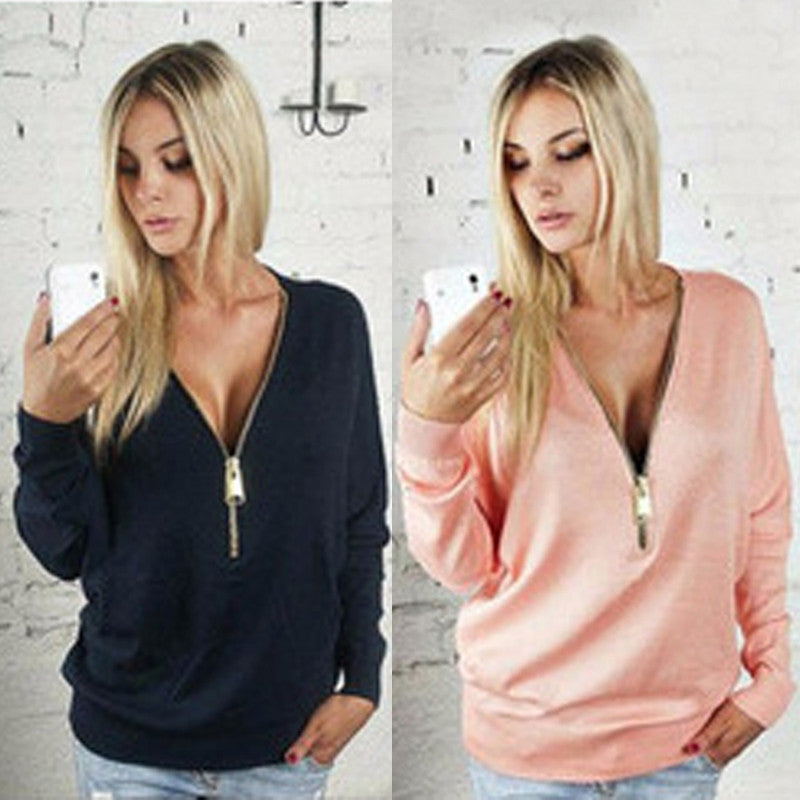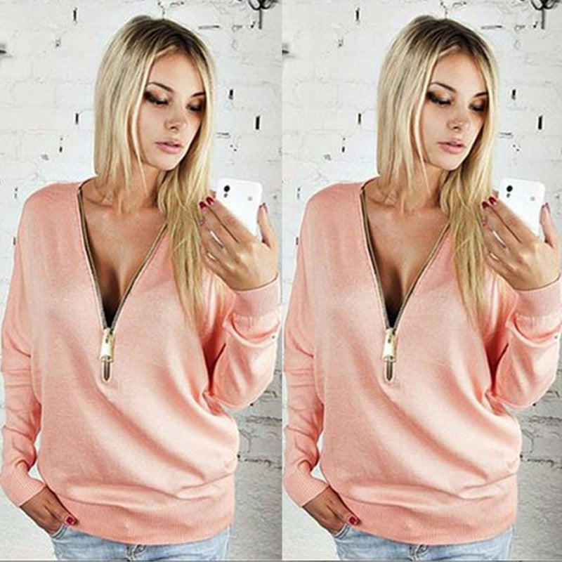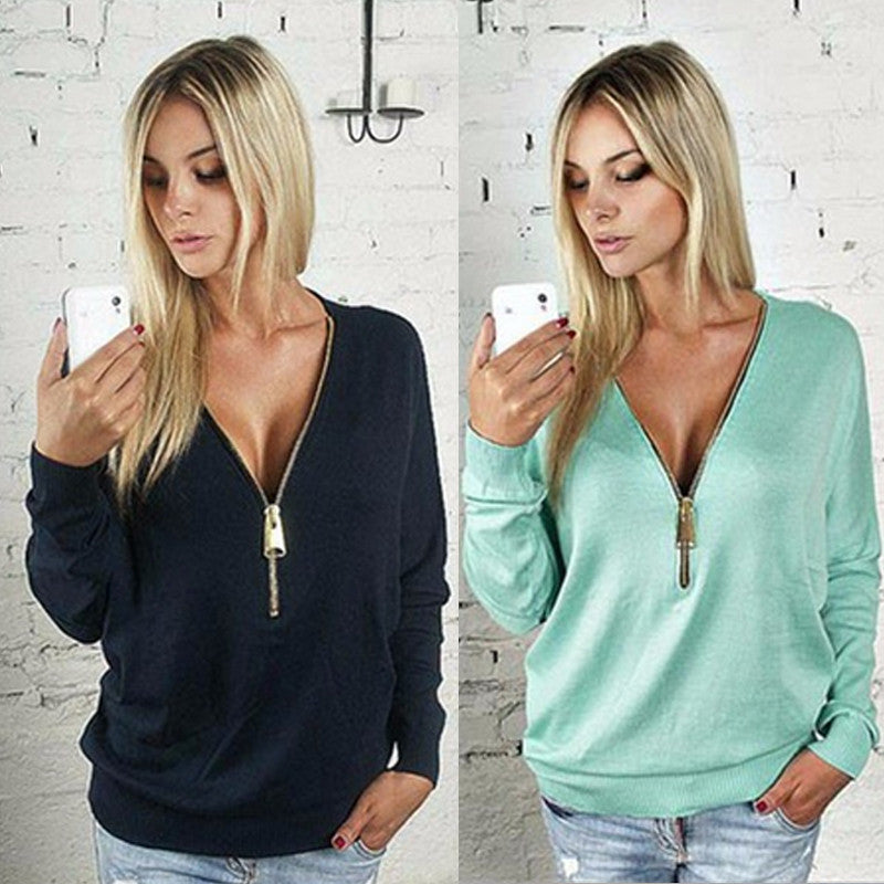 Fashion sexy women t shirt 2016 new v-neck zipper tops long sleeve black T shirt hot sale