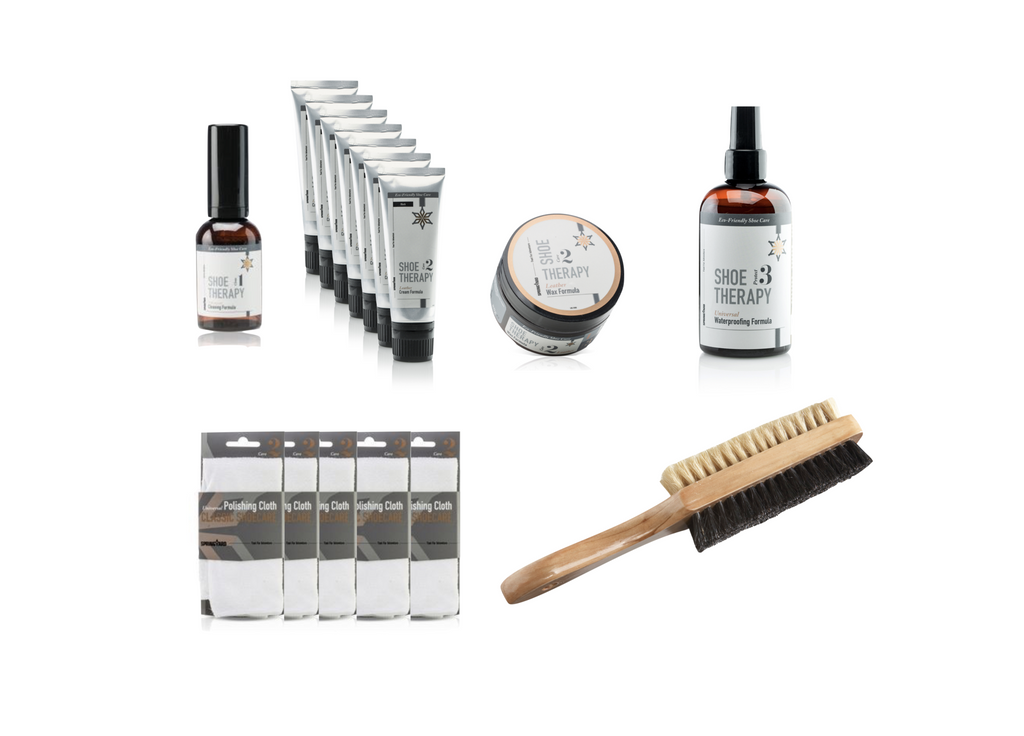 General shoe care set är ett fullmatad med produkter från den miljösmarta ShoeTherapy serie. Paketet fungerar bra som ett allround-kit i hemmet för vård av både finskor och skor i grövre läder, exempelvis kängor & boots.