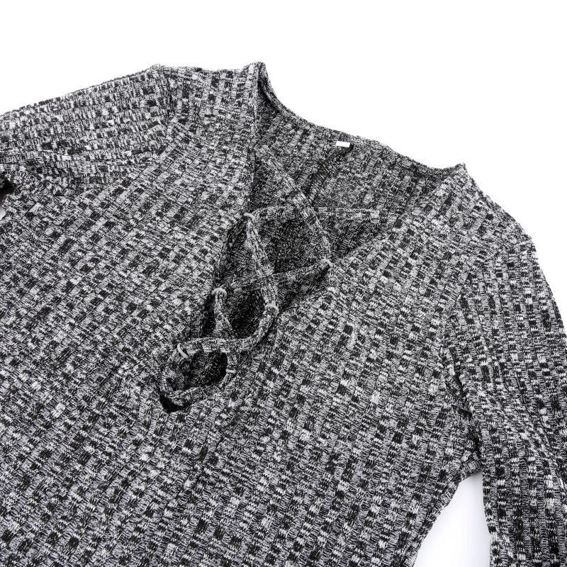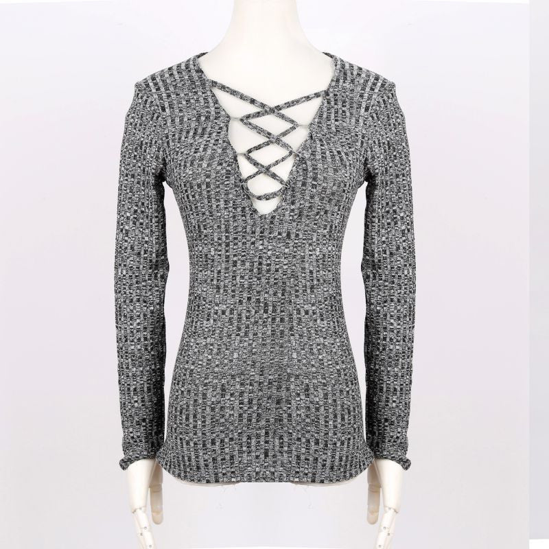 Lace up V Neck Top Lady Sexy Knitted Tops Pullover Cross Lace Up Long Sleeve T Shirt